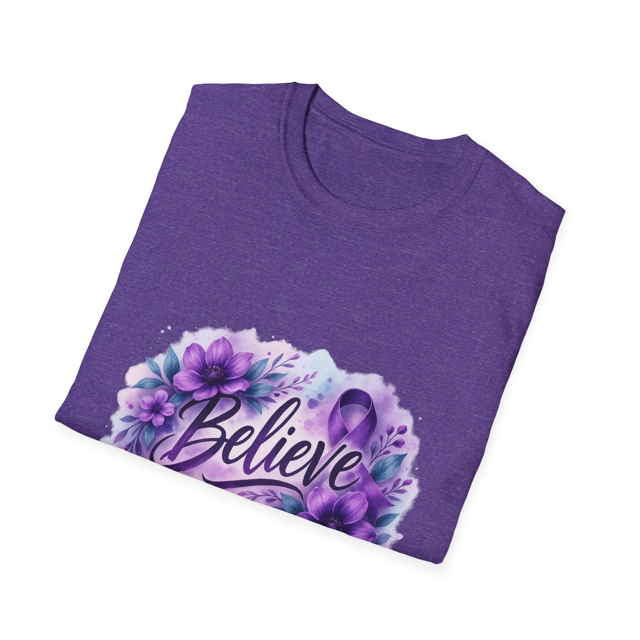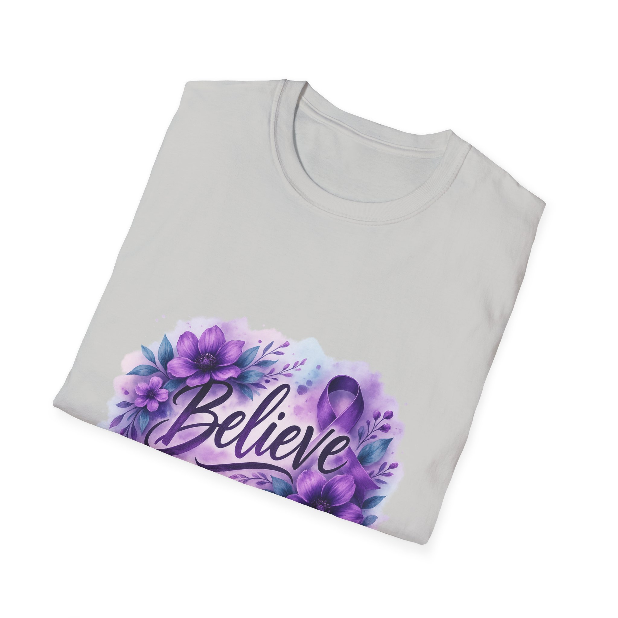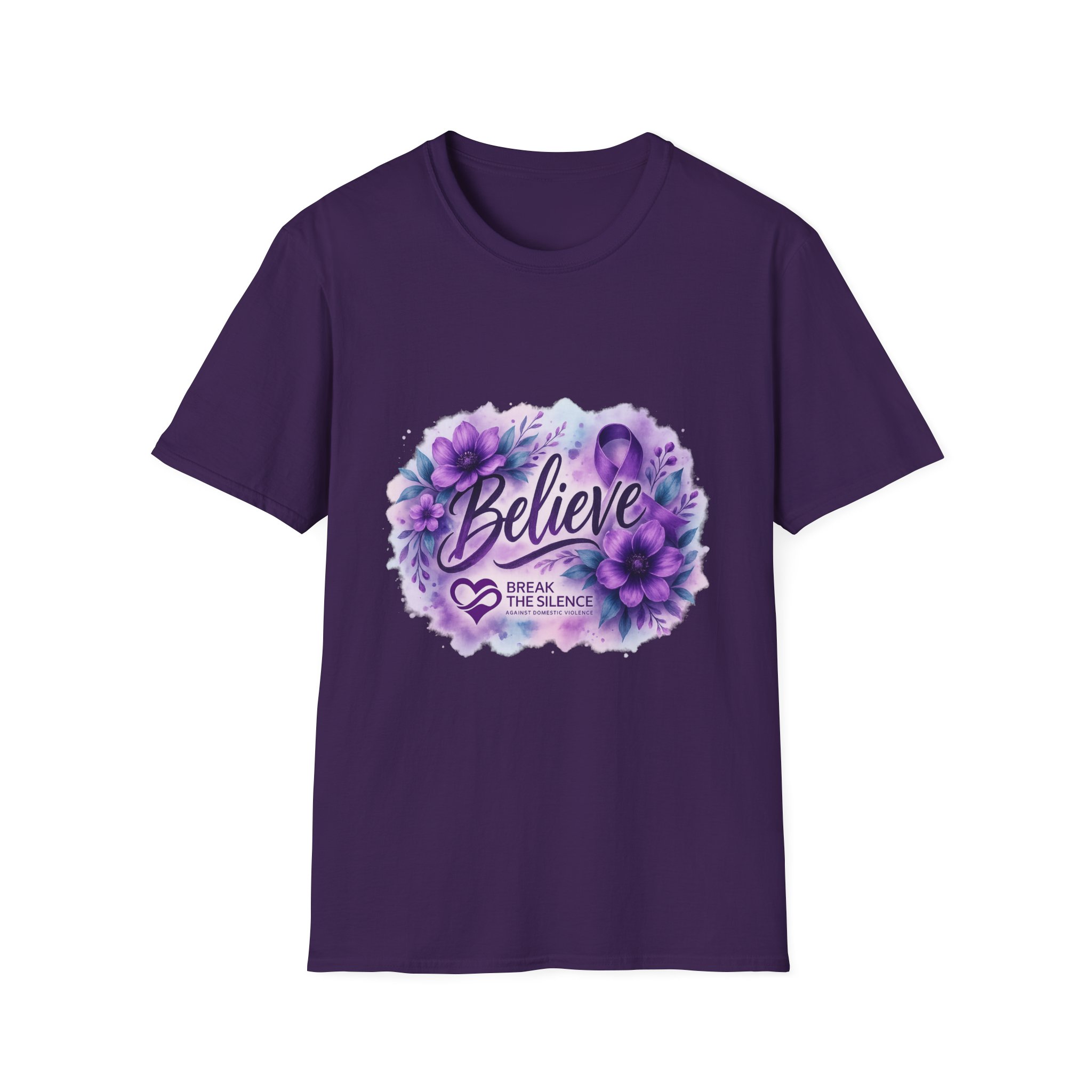 Soft, calming, and quietly bold — this lightweight tee carries a gentle reminder to ‘Believe’ surrounded by watercolor-style purple blooms. The soft ring-spun cotton feels breezy on the skin, while the smooth print sits softly on the chest so the message and artwork can speak without shouting. Wear it on slow mornings with a mug and journal, on volunteer days that demand quiet strength, or layered under a cardigan when you need a small, personal lift. The design’s muted lavender palette and hand-painted florals create a tranquil, hopeful mood that blends into everyday life rather than overpowering it.
