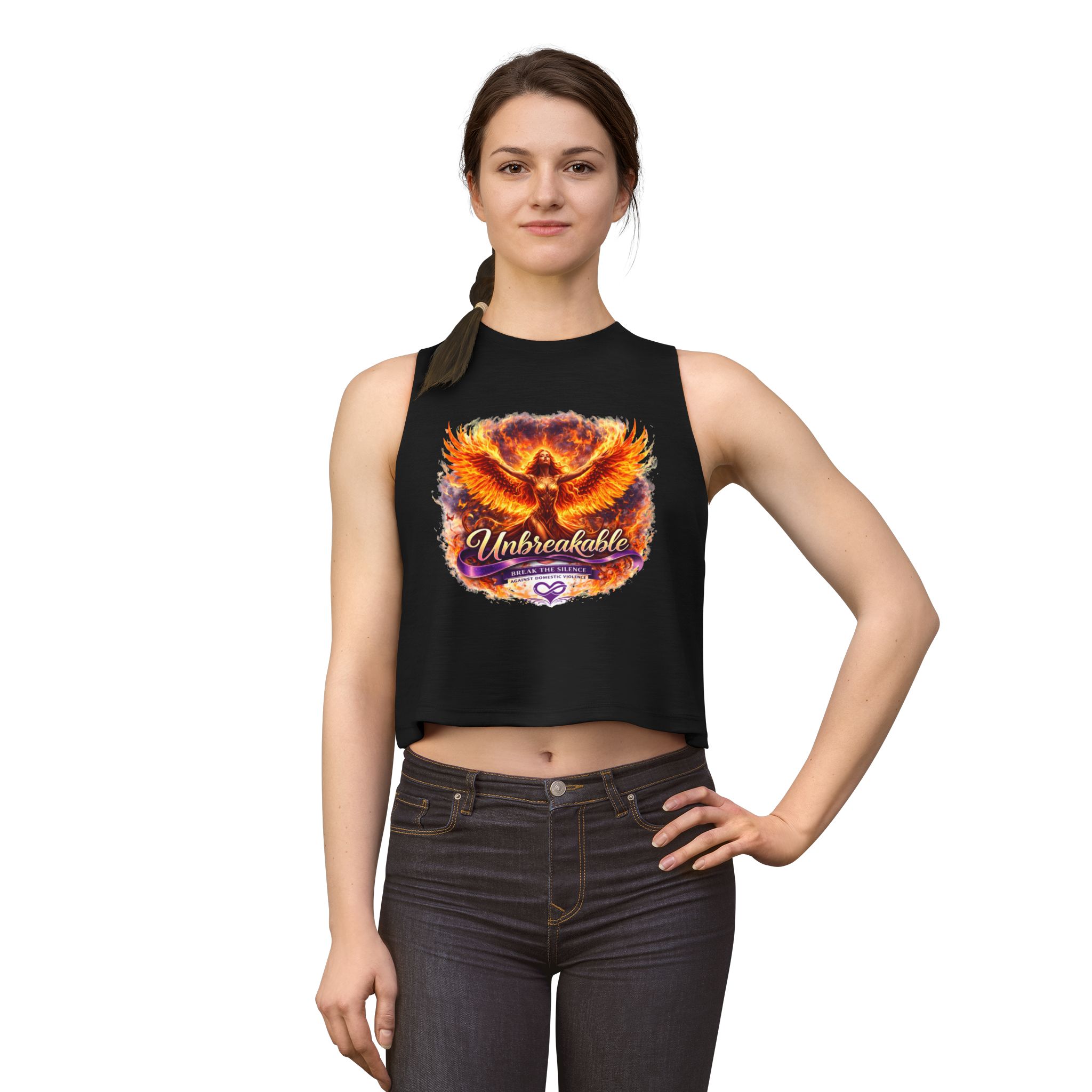 Light, airy, and full of spirit, this cropped tank brings a bold, phoenix-inspired design to everyday wear. The flame-toned artwork reads “Unbreakable,” a quiet declaration that sits over a soft heart emblem — it feels like armor and affirmation at once. The cut skims the waist with raw sleeve edges and a relaxed silhouette, letting movement breathe while the ribbed collar holds its shape. Wear it to workouts, late‑afternoon walks, or layered under an open shirt to keep that resilient, hopeful energy close.