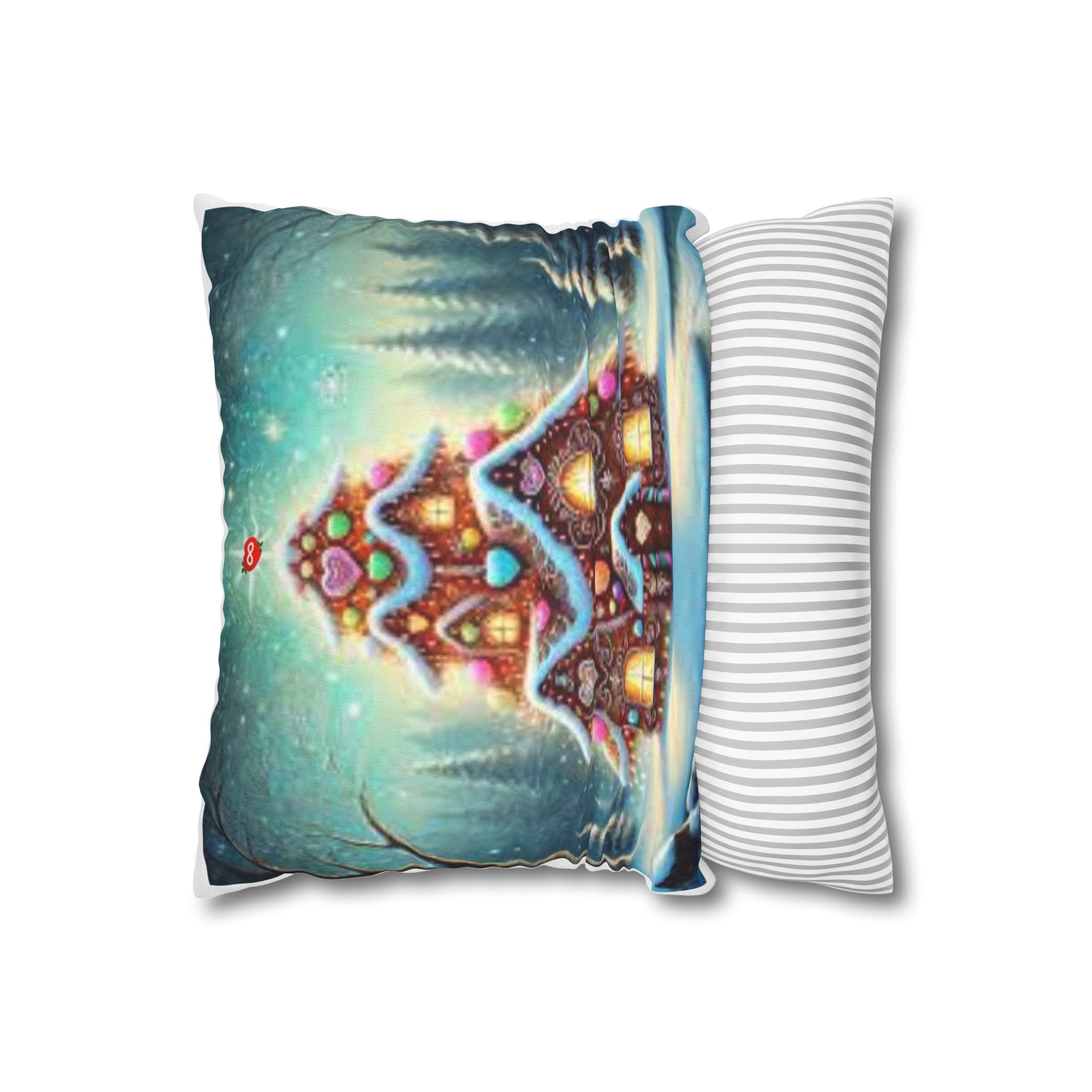 A cozy, storybook pillow cover that brings a wintry gingerbread cottage to your home. Soft spun polyester holds the vibrant double-sided print — candy hearts, glowing windows, and snow-dusted pines — with rich color and no ironing required. The concealed beige zipper keeps the design seamless while a striped interior lining peeks out when removed. Slide this cover over your favorite insert to add a warm, whimsical touch to quiet evenings, holiday hosting, or a cabin-style living room.