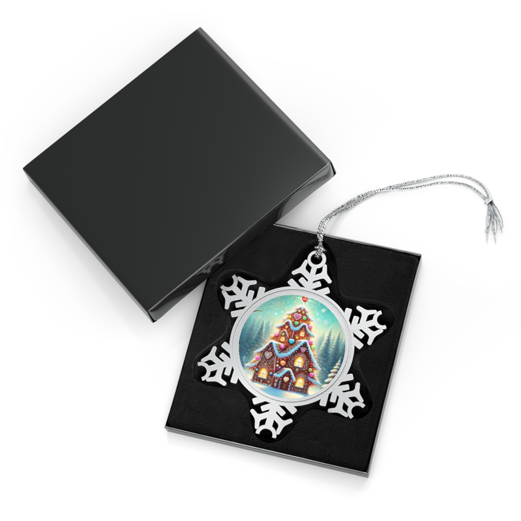 Hand-cast pewter meets a touch of winter magic. This snowflake ornament feels cool and substantial in your hand, its intricate cutwork catching light on a frosty mantel. At the center, vibrant printing brings a cozy gingerbread-style cottage to life — warm windows, candy-like details, and a soft snowfall that draws you in. The included silver-toned hanging string blends seamlessly with the pewter finish, and the black presentation box gives the piece a quiet, elegant moment when unwrapped. Hang it on a tree branch, add it to a wreath, or tuck it into a seasonal display where its weight and detail can be noticed and appreciated.