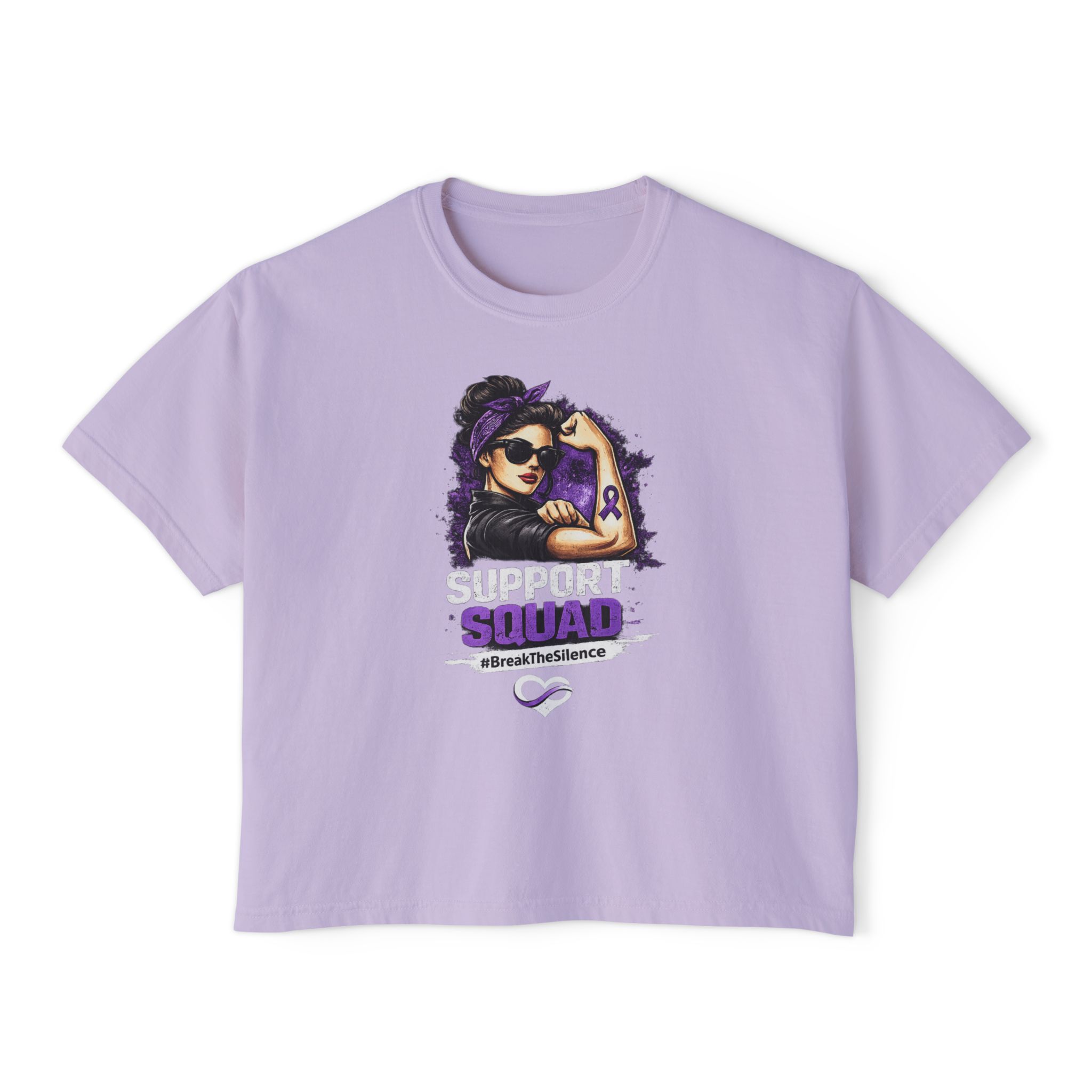 This cropped boxy tee brings confident, street-ready energy to casual days. Soft but substantial ring-spun cotton and pigment-dyed color give it a lived-in, vintage feel that keeps getting better with wear. The graphic — a bold, retro-inspired woman in shades with the words “Support Squad” — reads like a rallying badge: wear it to signal solidarity, sass, and quiet strength. The roomy cut and slightly shortened body layer effortlessly over high-waist jeans or a slip dress, and the reinforced shoulder tape keeps the shape through repeated washes. It’s the kind of shirt you reach for when you want to feel seen and steady, whether you’re running errands, meeting friends for coffee, or leaning into a day of creative work.