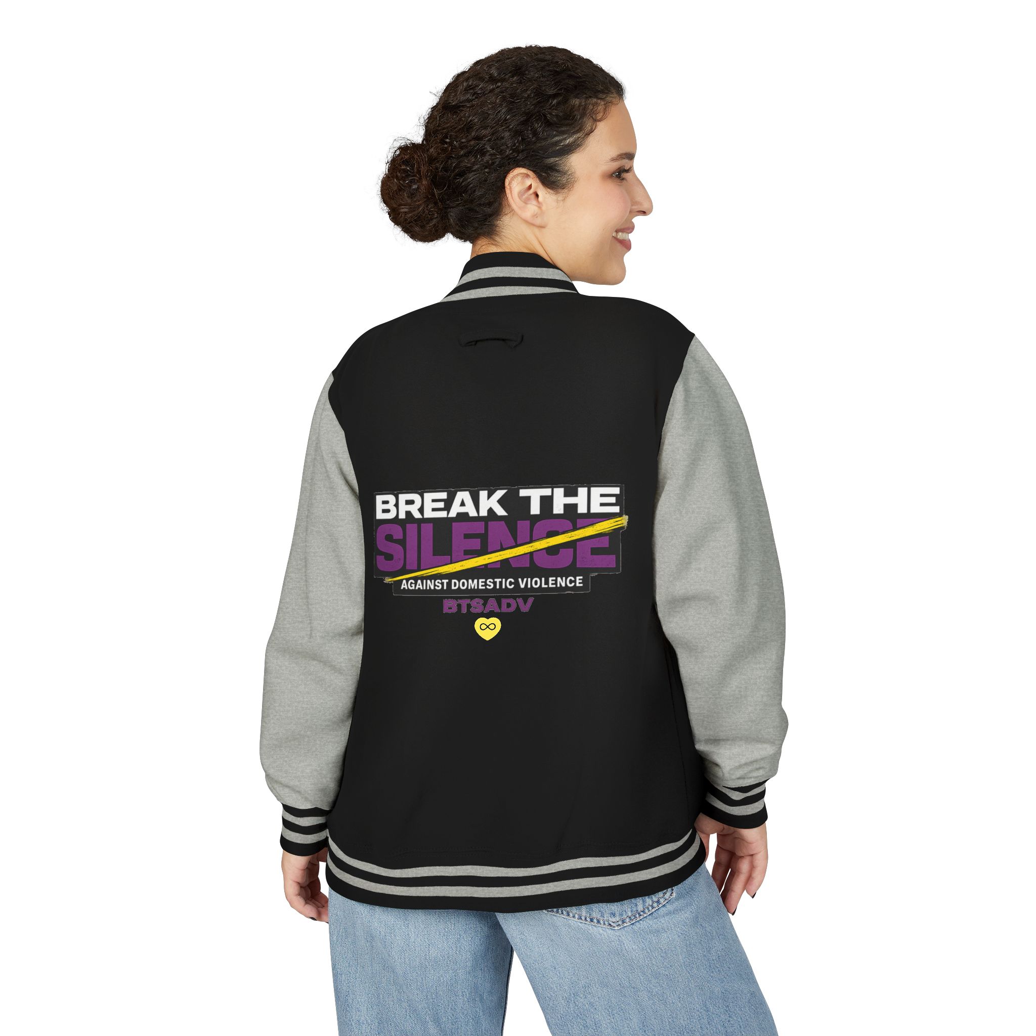 This letterman jacket carries quiet strength. A structured, medium-weight body with soft, garment-dyed cotton feels familiar from the first wear. On the chest, a subtle heart and infinity emblem reads “Warrior,” while the back voices a clear call: “Break the Silence” with bold purple and gold accents and a small heart—an outward emblem of advocacy and solidarity. It layers easily over hoodies or tees and holds its shape through seasons, becoming a wearable statement for anyone who shows up to support survivors and push conversations forward.